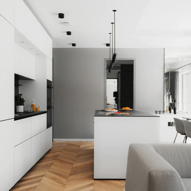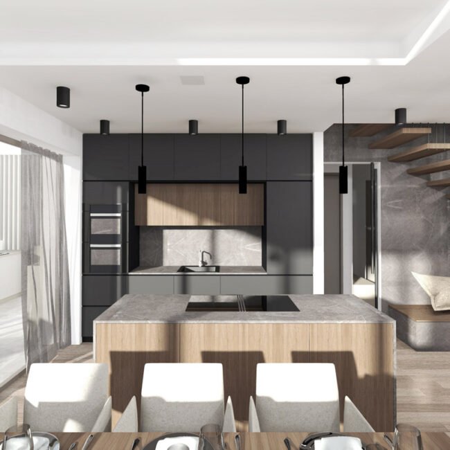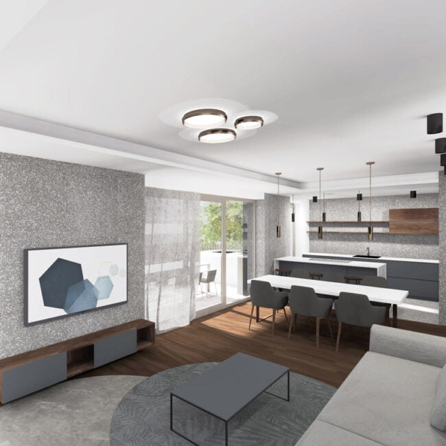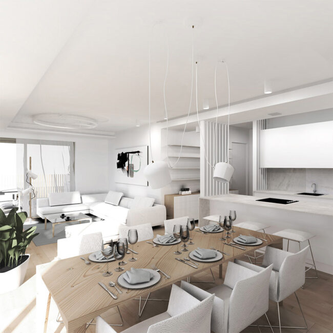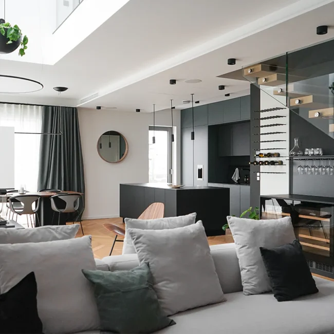 The Belin House and its apartments are designed in a luxurious manner. The apartments are spacious and come with high ceilings, spacious terraces and large window openings that connect living areas with terraces. The apartments on the upper floors feel even more spacious due to two-level areas that connect living areas and galleries. The contemporary design of the apartments with open and connected living residential areas and an advanced technological furnishing allow a contemporary way of living and exceptional comfort.