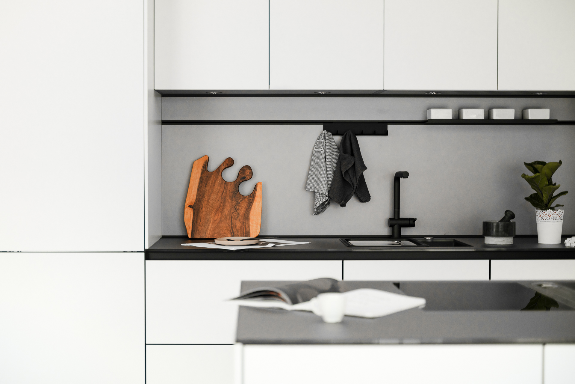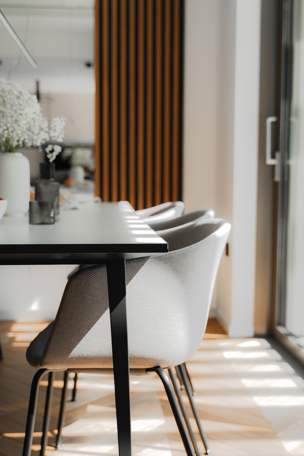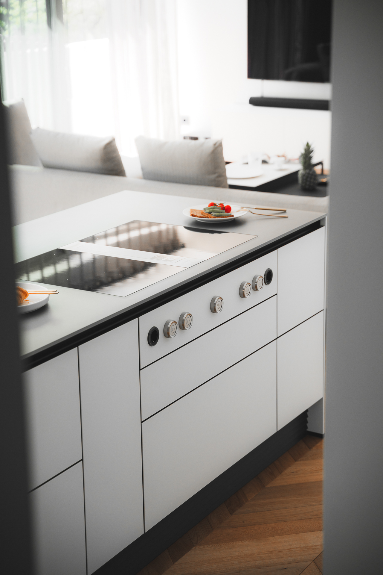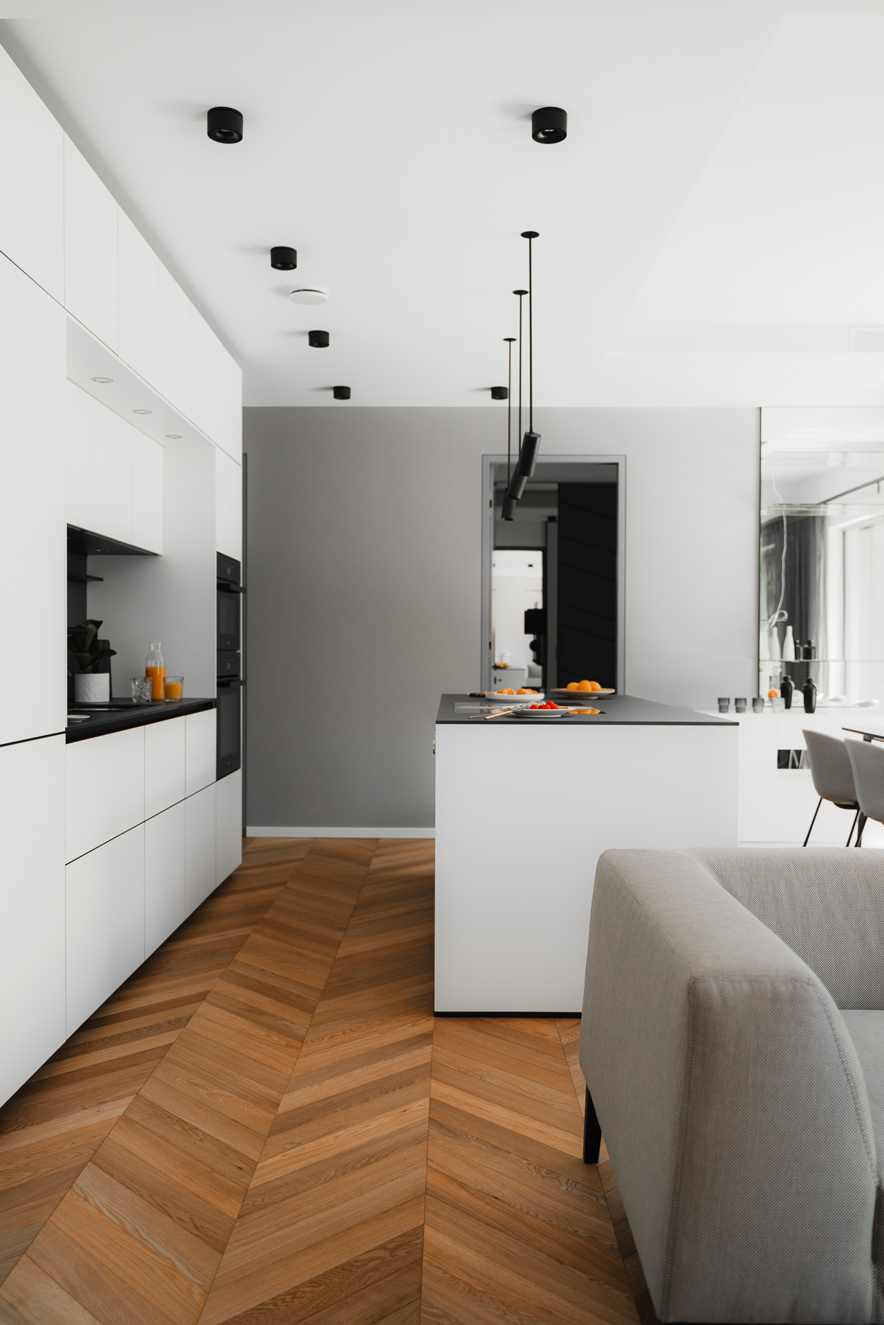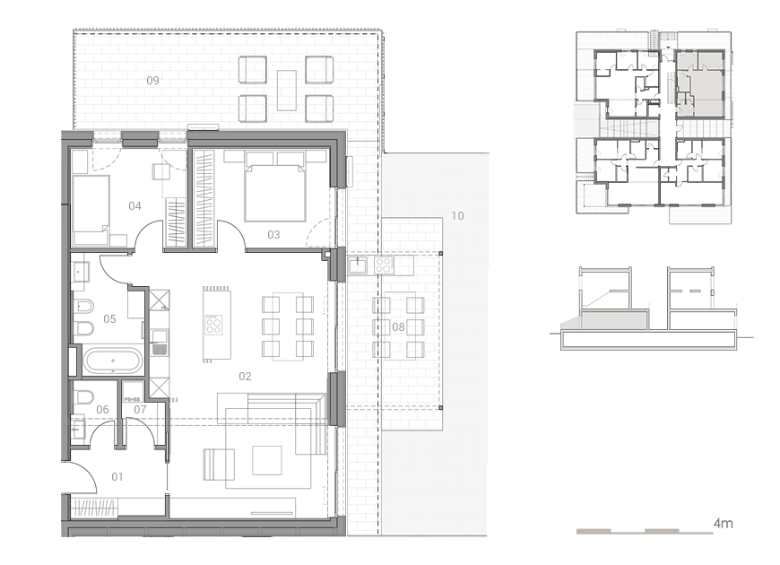 is a two-bedroom ground floor apartment with a south-east orientation. The apartment includes: a spacious living area with contemporary design including a kitchen with an island, bedroom, a spare room, utility area, bathroom and a separate toilet. A spacious terrace surrounds the apartment on the south and the west side and can be accessed through the living and sleeping areas. The terrace is enclosed and elevated above the level of the surrounding terrain. There is a storage area and two private parking spaces designated to the apartment in the basement.